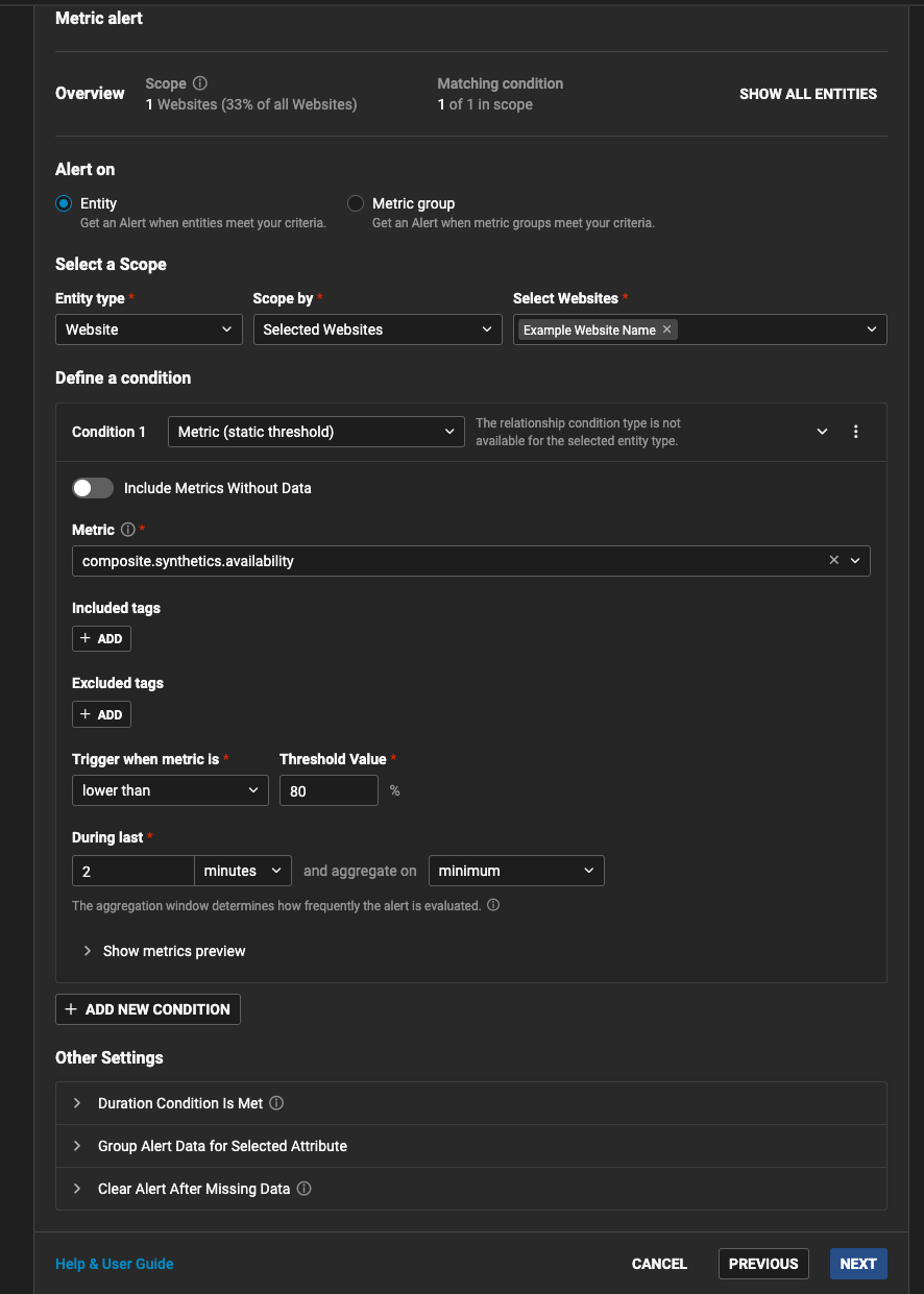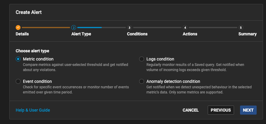 - In the next step choose ‘Metric condition’ alert type.