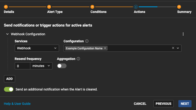 - In the next step make sure that in the ‘Services’ dropdown ‘Webhook’ option is selected and ‘Send an additional notification when the Alert is cleared.’ is toggled. Please also make sure that alert resending is disabled by setting resend frequency to 0 and ‘Aggregation’ is OFF.