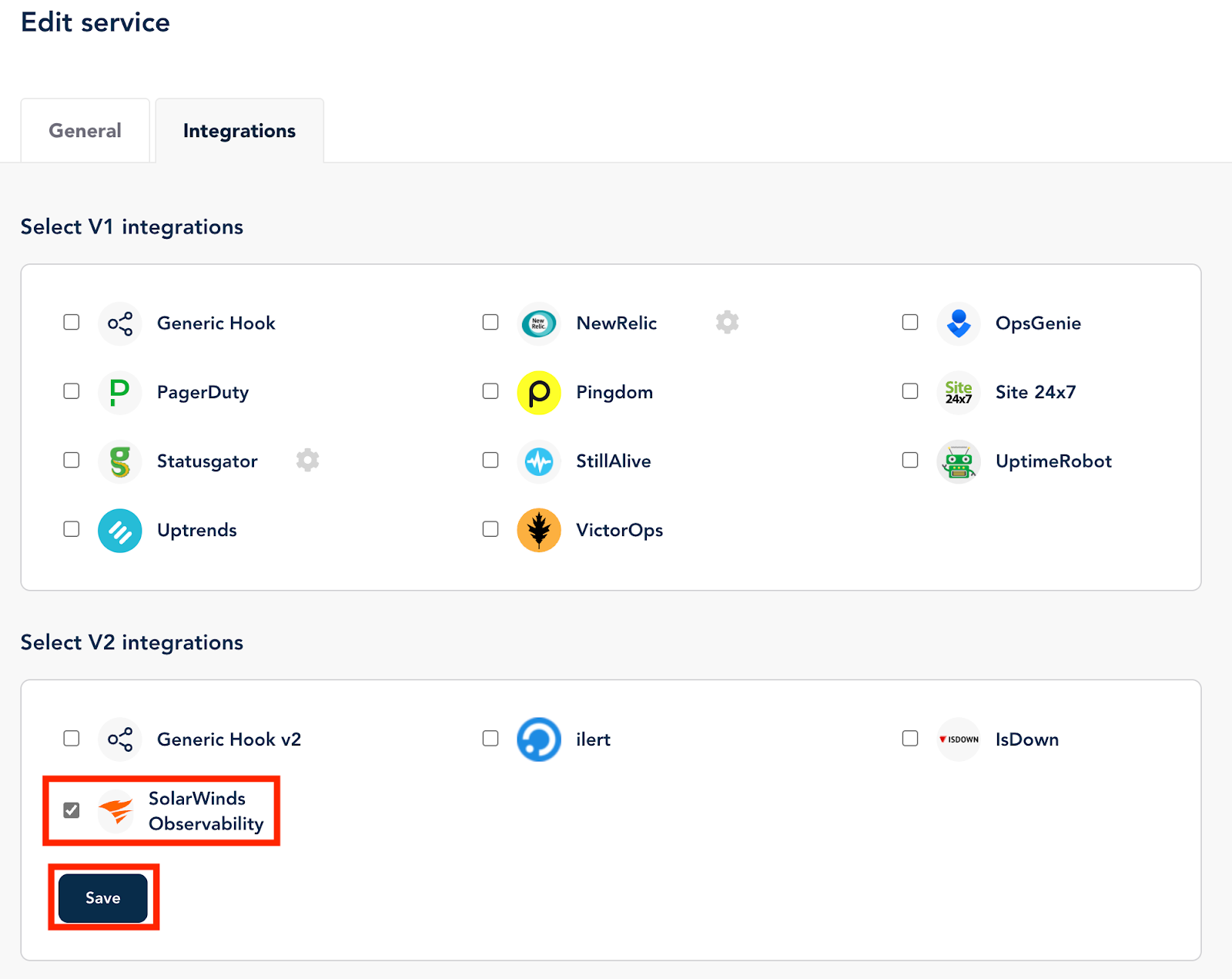 Under Edit services, select Integrations and choose SolarWinds Observability, then save.