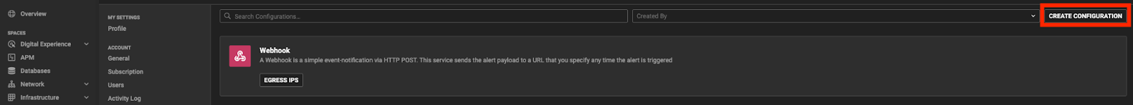 - Configure your webhook by clicking ‘Create Configuration’