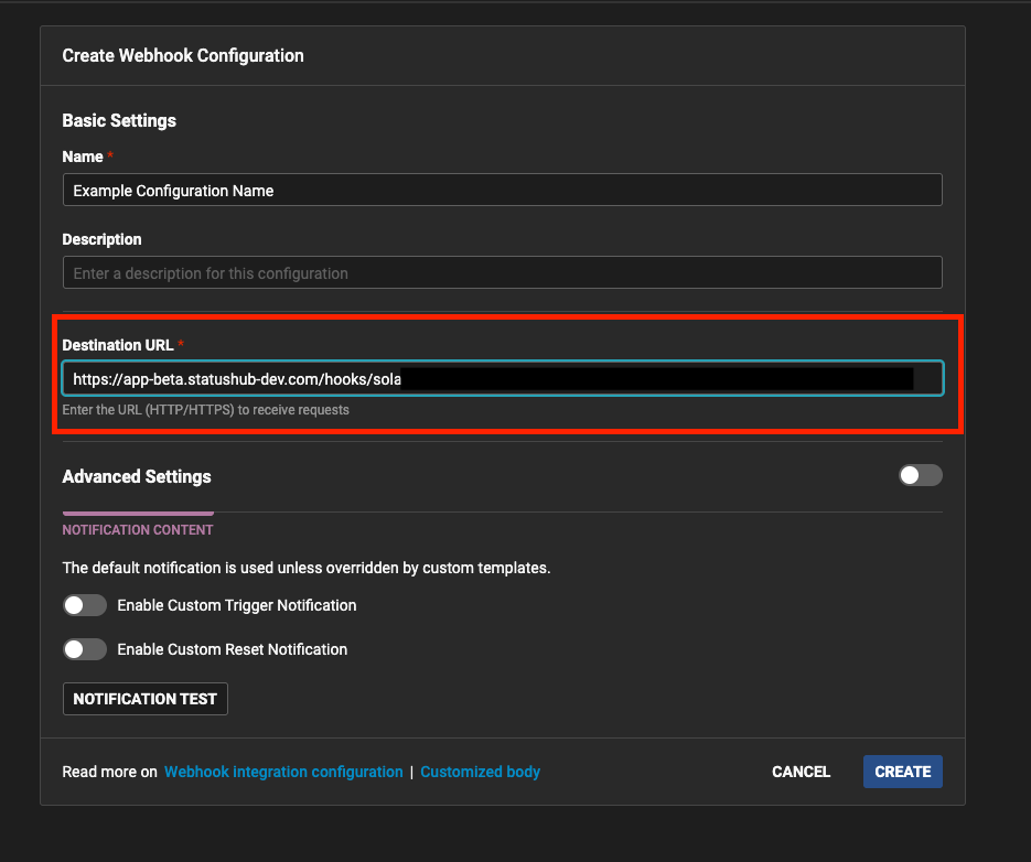 - In the ‘Destination URL’ field, paste the Webhook URL copied from the StatusHub Services and Integrations section and save the settings.