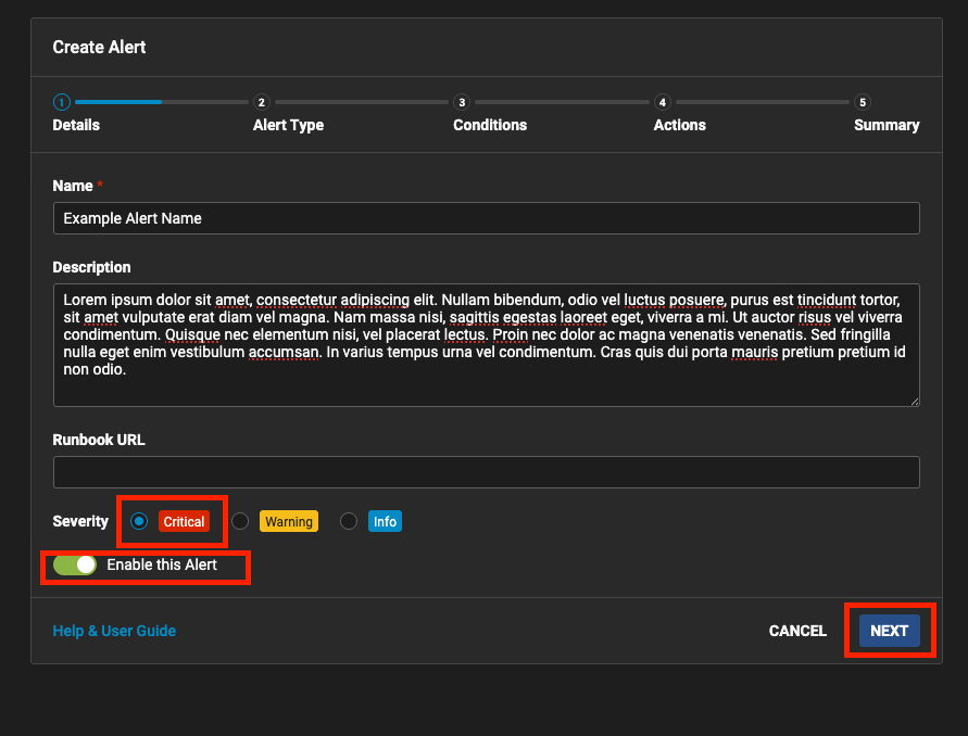 Remember to toggle ‘Enable this Alert’ and choose Severity option as ‘Critical’.