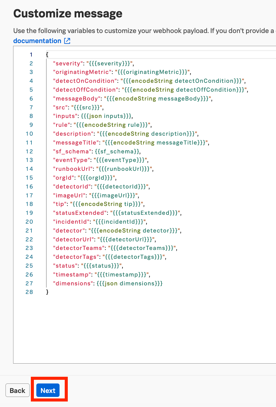 - You can customize your webhook payload. Required fields are: