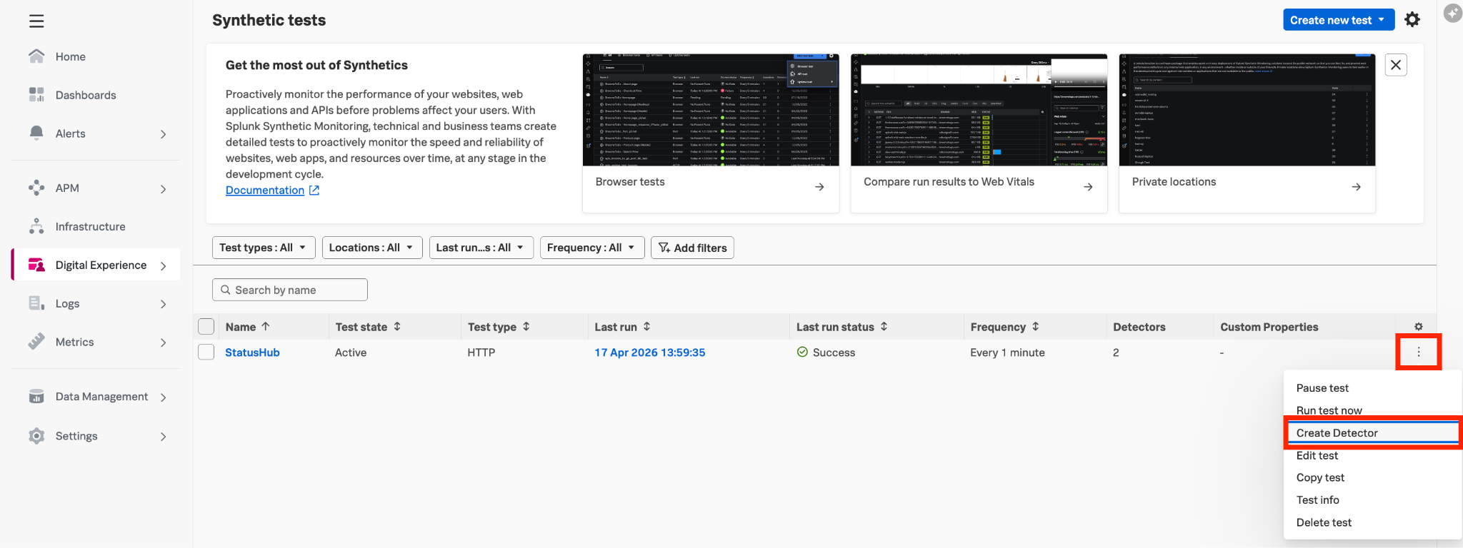 - In ‘Synthetic tests’, create your detector by clicking 3 dots to the right of your Synthetic test and click ‘Create Detector’.
