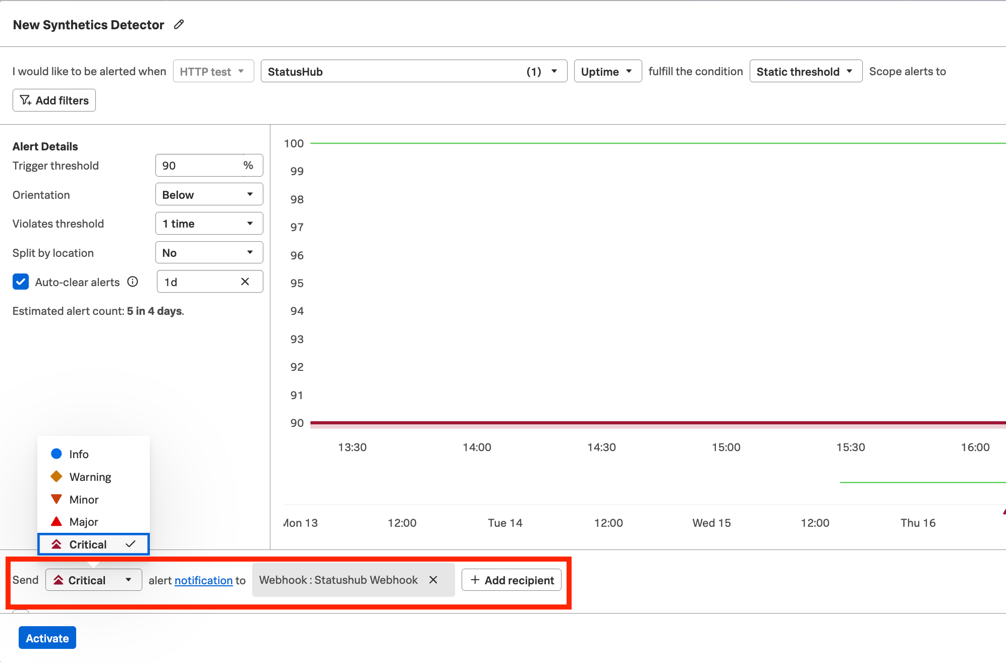 - In the next step, fill the Alert Details section, and choose the appropriate severity. You can customize your notification message in the notification link. Add a webhook by clicking ‘Add recipient’ and choosing your custom webhook.